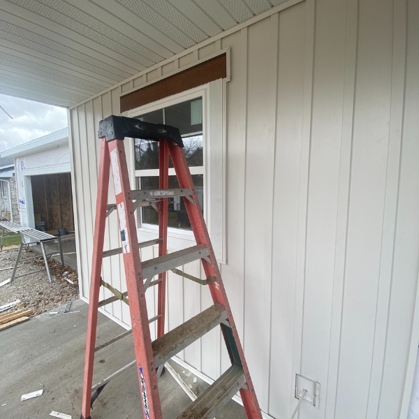 I chose Blue Door Linen Board and Batten for the front of the house so it looked cottage-y. The rest of the house is Linen lap siding. I should’ve taken a photo farther away, but she be how she be.